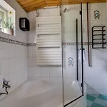 Boshuisje Felua Villa har också utsikt över trädgården. I badrummet finns en separat toalett, ett badkar och en dusch samt hårtorkar och handdukar.